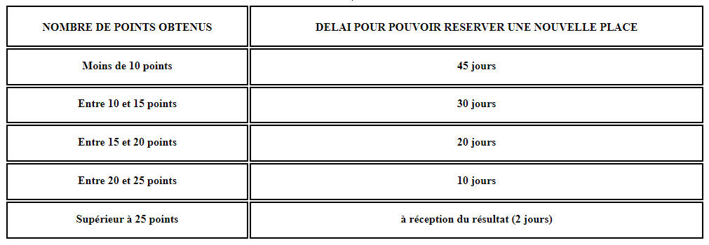 Le délai de présentation à la suite d'un ajournement à l'examen pratique est inversement proportionnel au nombre de points obtenus.Contactez par SMS Monsieur LATOUR, votre moniteur, afin d'établir le nombre de leçons de conduite vous étant nécessaires pour une représentation à l'examen pratique.